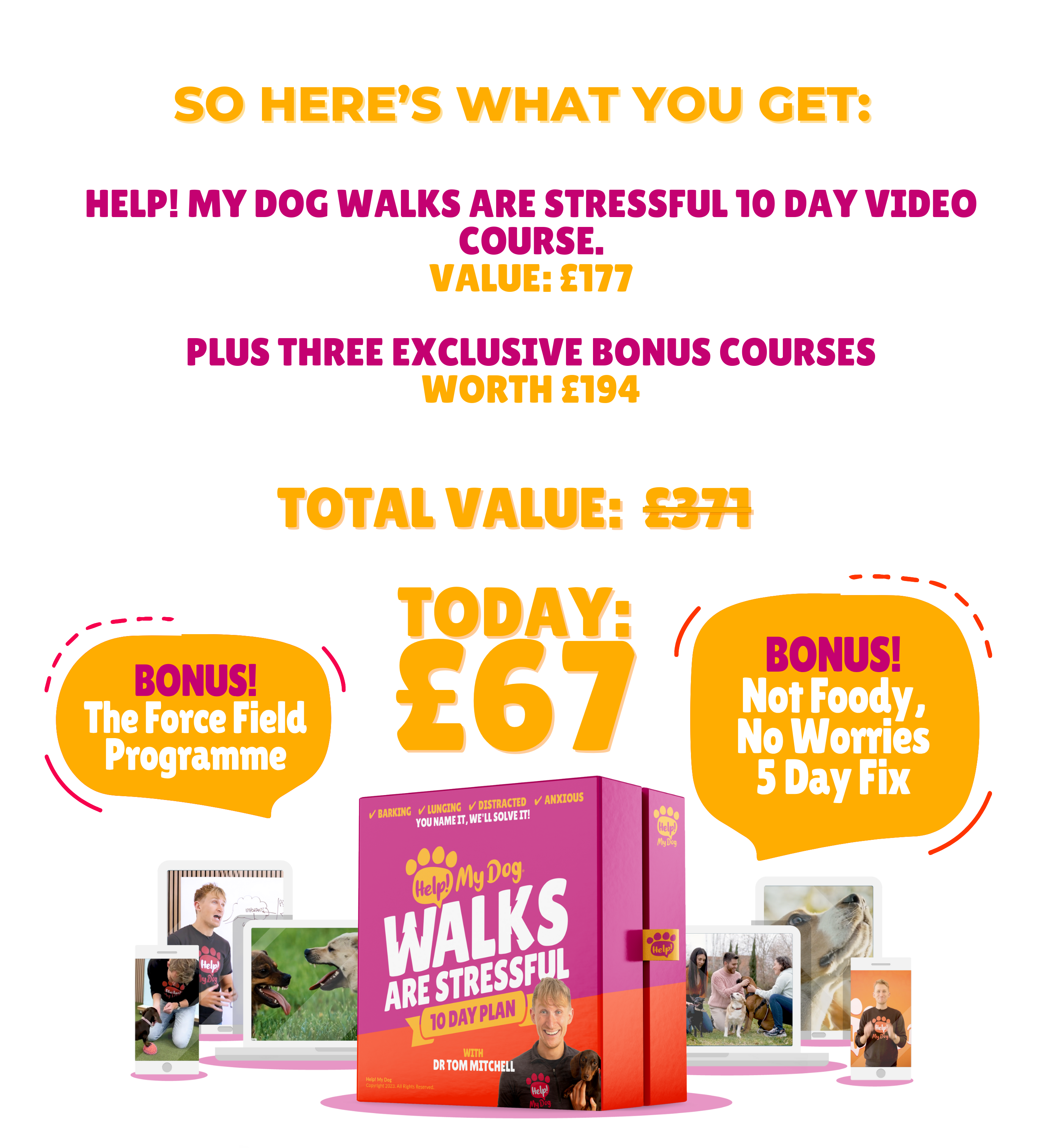 4. Also, if you buy the course today, you’ll get two extra bonuses. One teaching you how to create a force field bubble around you and your dog to stop others dogs or people invading, one teaching you how to work with your dog if they aren’t a “foody” right now.